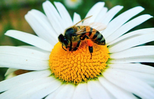 A typical bee. Note the fuzz covering its legs that allows them to pick up pollen and transfer it to other flowers. From Wikimedia commons.